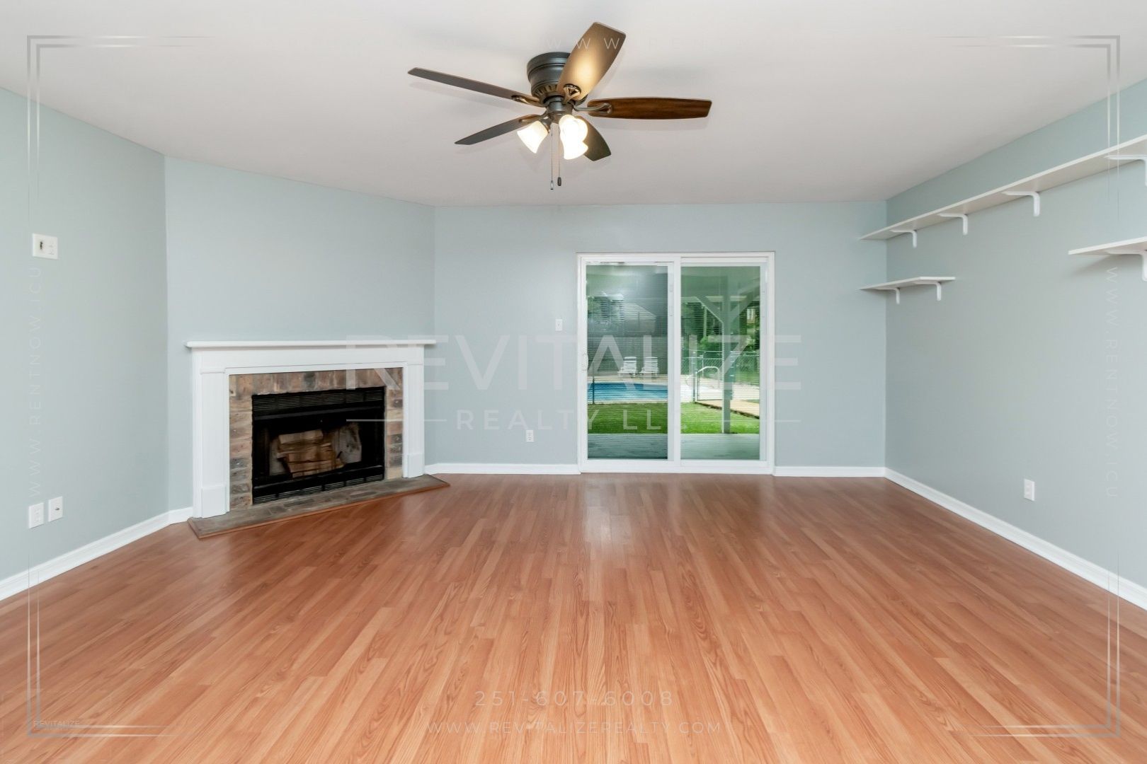 Beautiful brick and wood‑exterior home with paved driveway features hardwood and travertine floors. The living area includes a fireplace creating a welcoming interior and inviting focal point. Big windows provide plenty of natural lighting throughout the home, and floating shelves can be used for decorative items. To add comfort, there are ceiling fans and window blinds which help keep a cool environment. The full kitchen includes a refrigerator, stove/oven with a vent hood, dishwasher, and ample cabinets for storage.