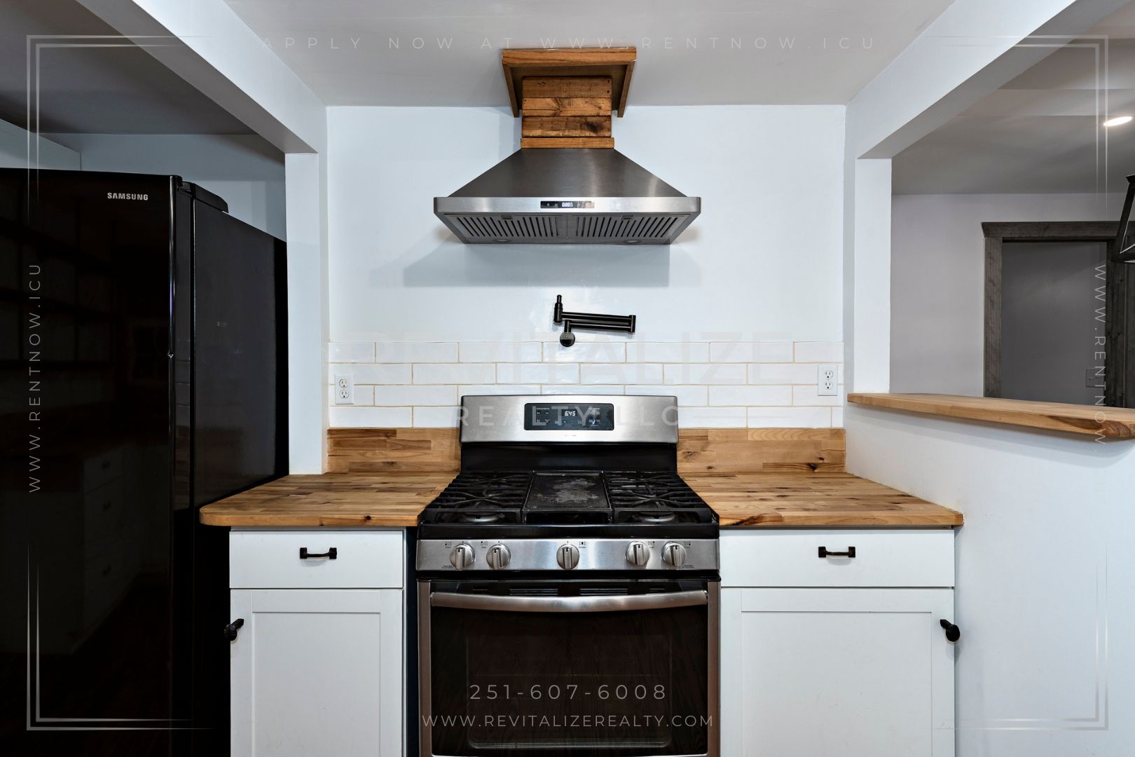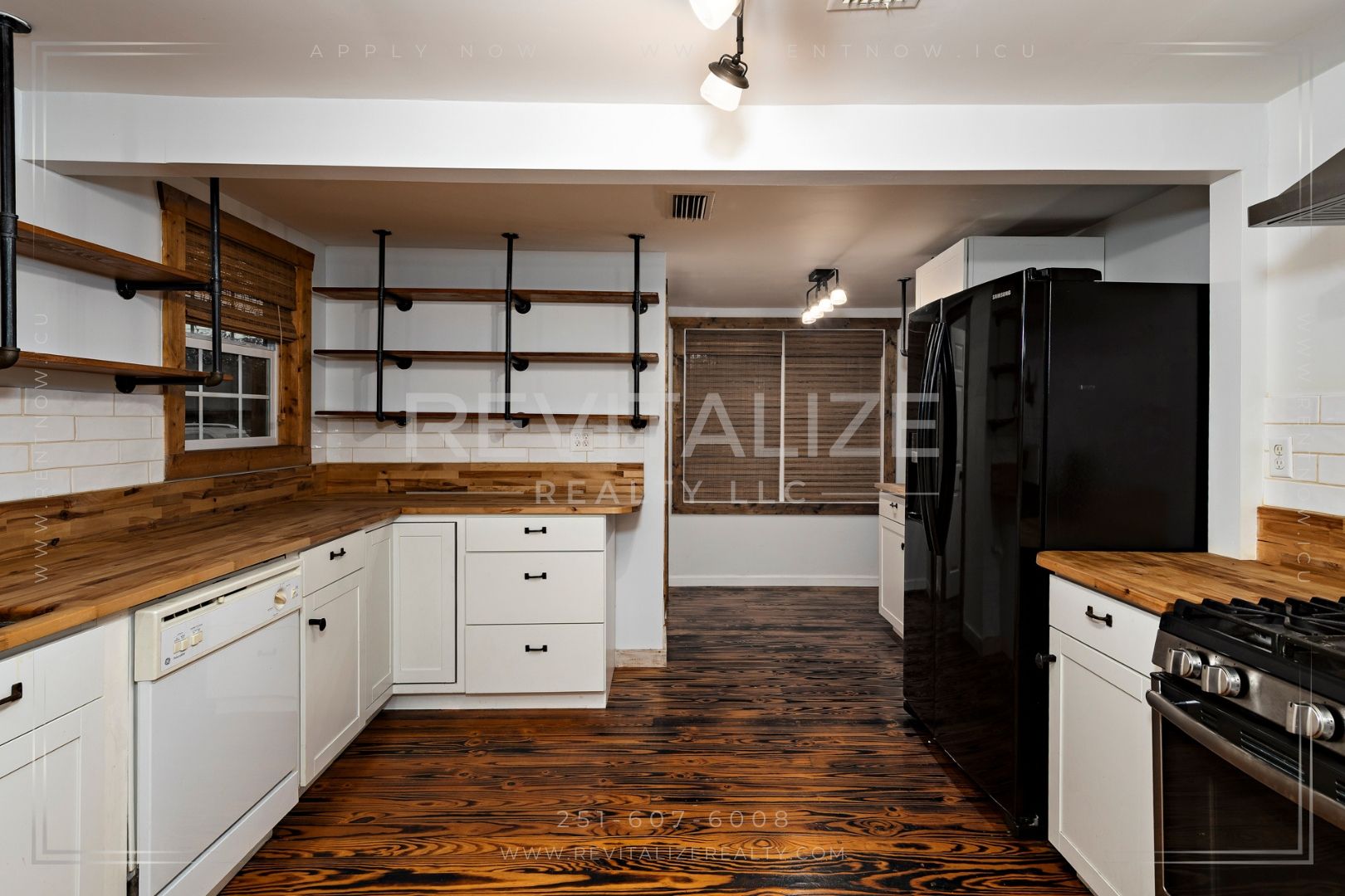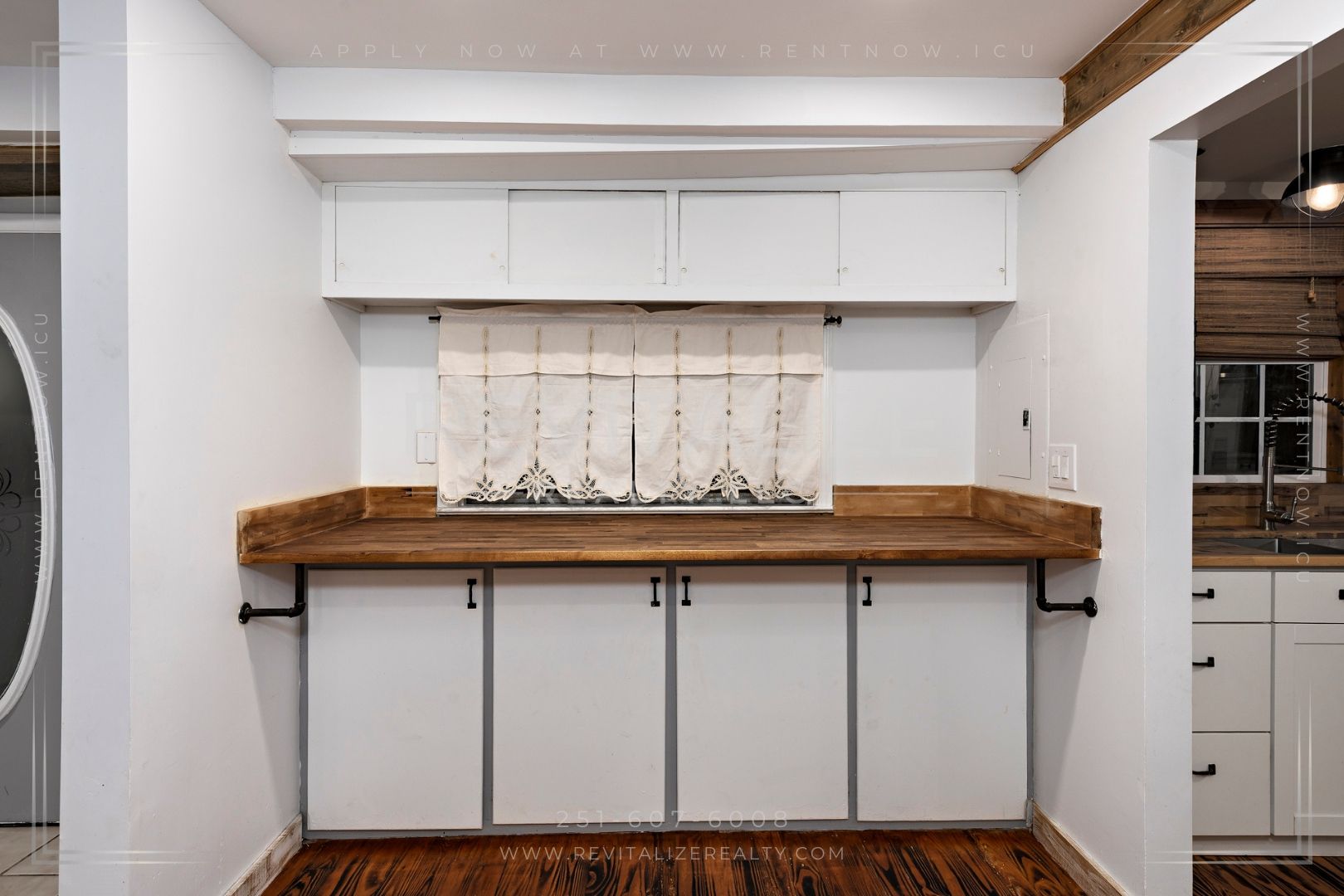 The open-concept kitchen is designed with style and practicality in mind, featuring butcher block countertops, open shelving, and a spacious layout perfect for casual dining or entertaining. A separate laundry room and ample closet space throughout provide all the storage you need for comfortable living.